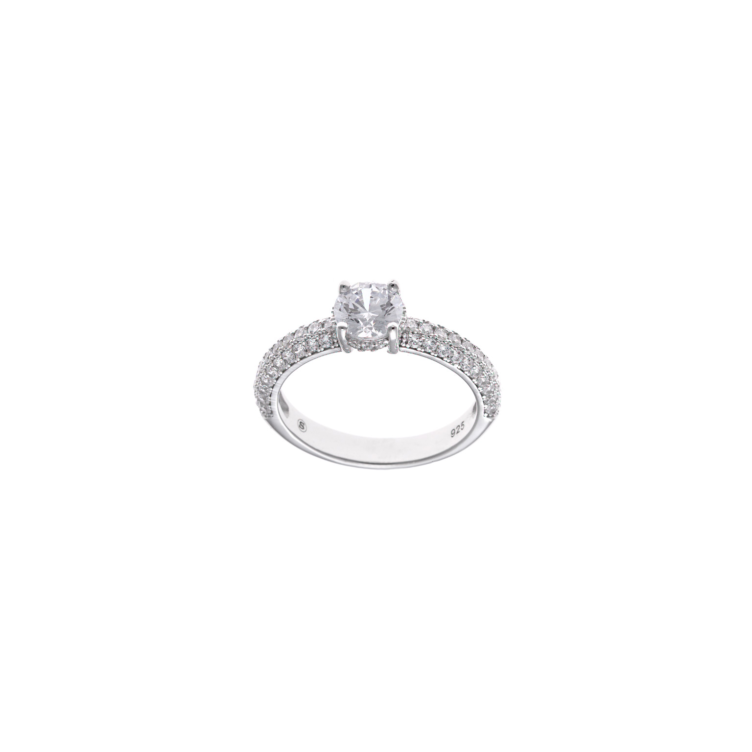 Anillo Salvatore plata rodiada tipo solitario con circonita blanca central talla brillante tres tiras laterales circonitas blancas micropavé