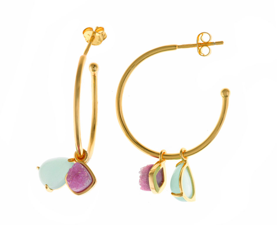 Pendientes colección Druse que combina piedras drusas de colores intensos, con tonos pastel en talla cabujón. Piedras color verde agua y cuarzo rosa. Los colgantes se pueden quitar del pendiente